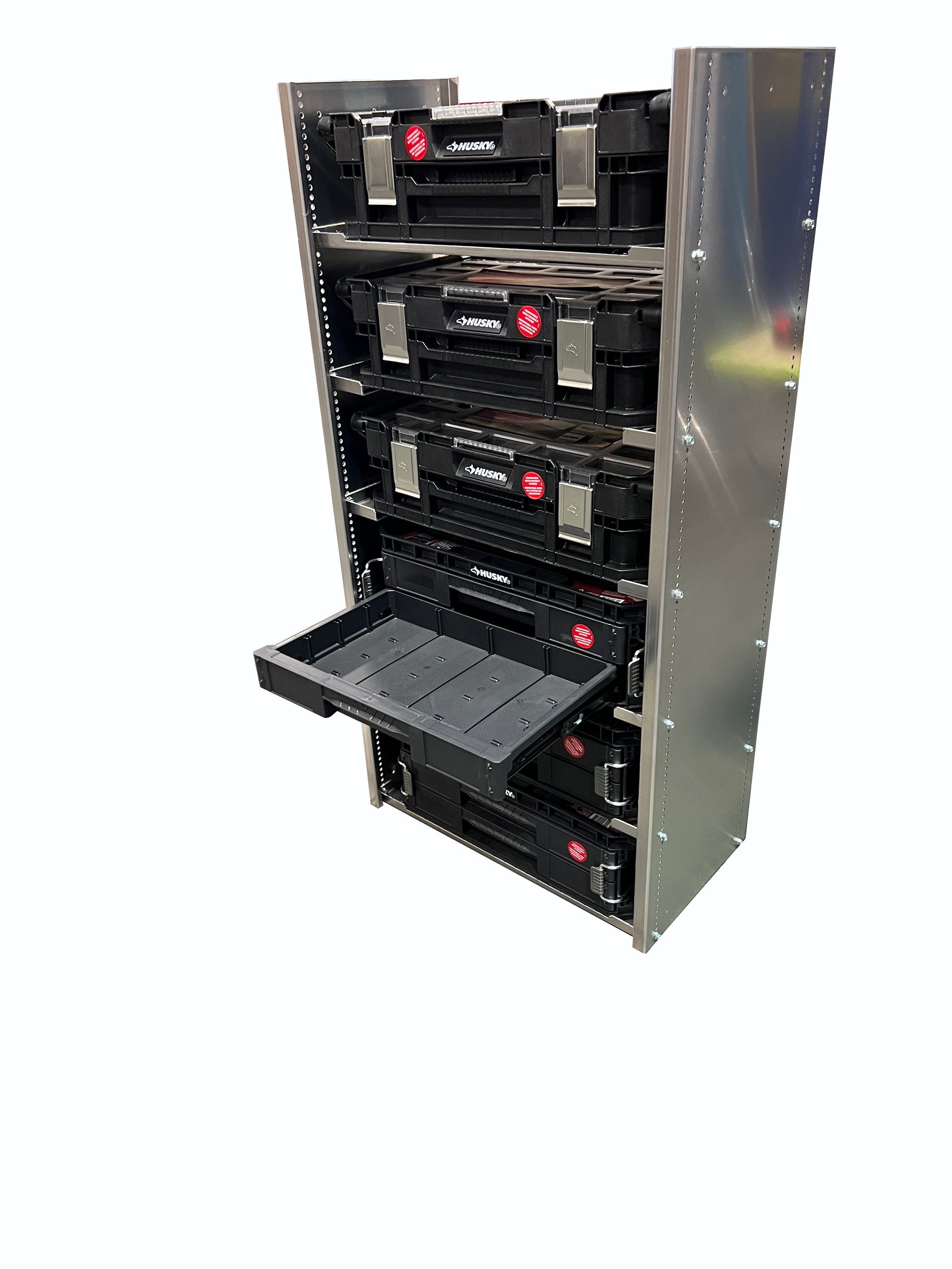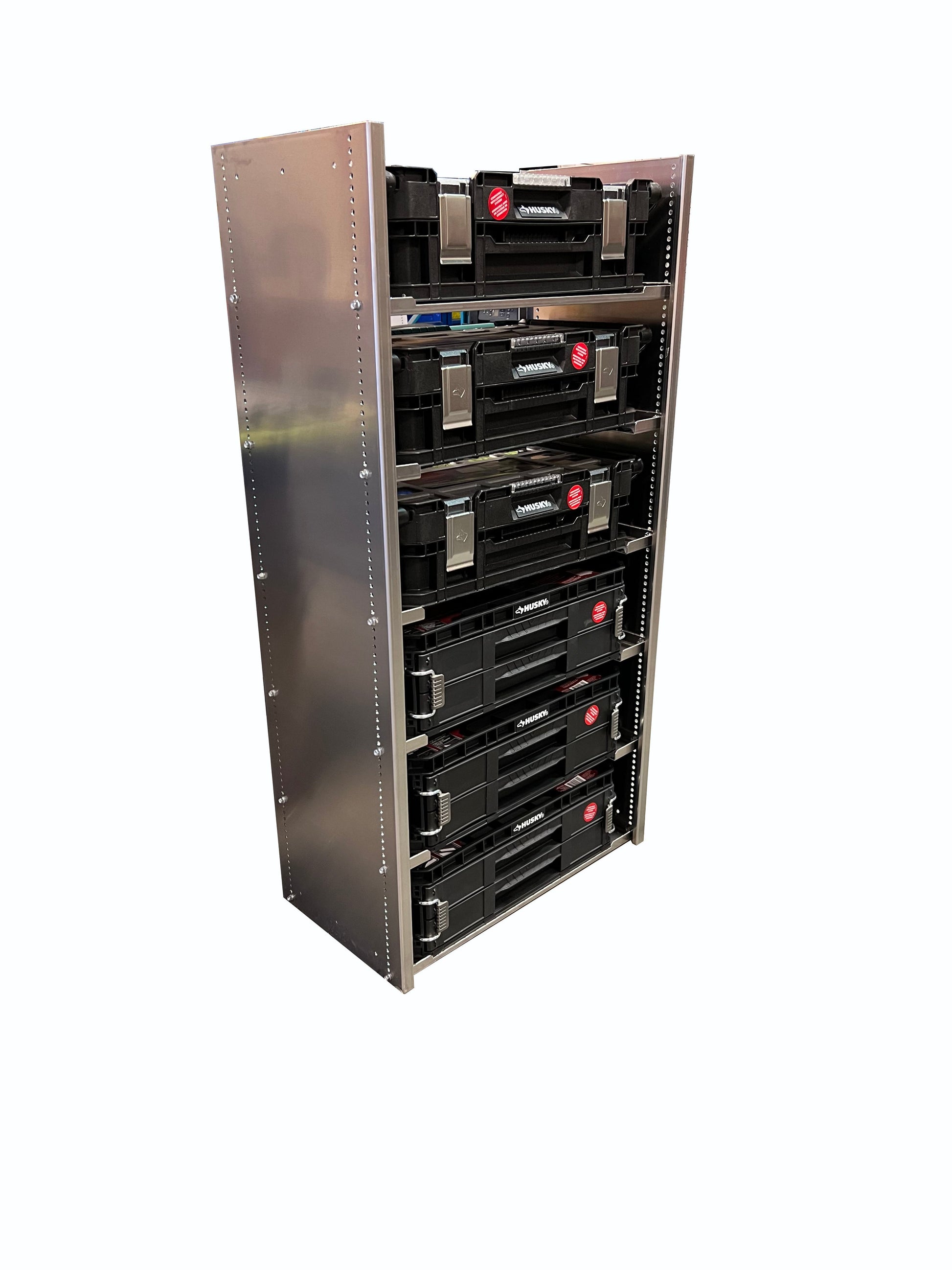 Are you Upfitting a truck or van? This parts bin storage unit is specifically designed to work with the 22inch connect drawer and cantilever organizers. This unit includes 2- walls, 3 solid (2 Solid shelves on 36" and 24" tall) shelves and side support shelves based on height selection. Basic hand tools are required for assembly. Bins and installation hardware are not included.