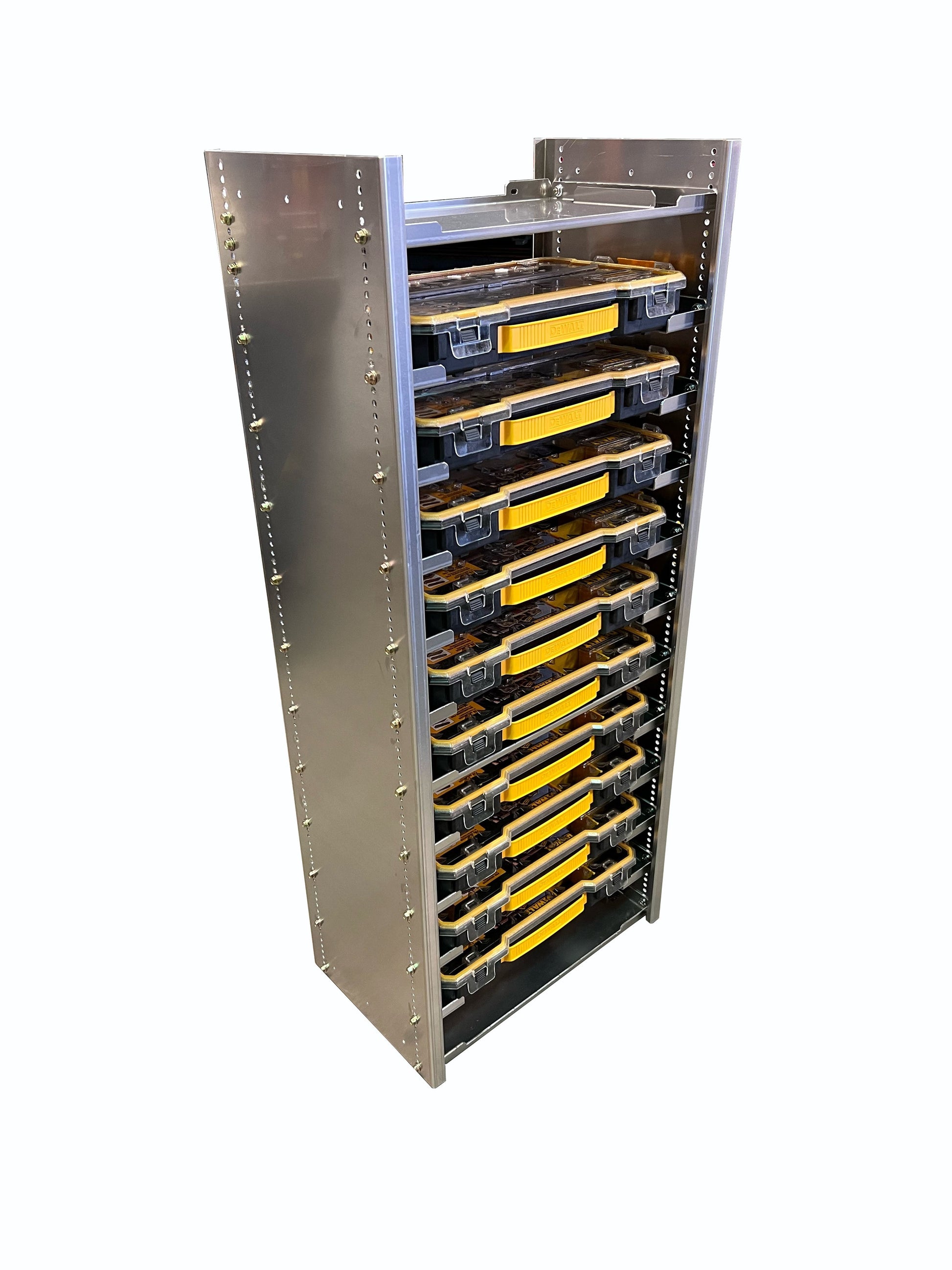 Are you Upfitting a truck or van? This parts bin storage unit is specifically designed to work with the popular Dewalt Pro DWST14830 bins. This unit includes 2- walls, 3 solid (2 Solid shelves on 36" and 24" tall) shelves and side support shelves based on height selection. Basic hand tools are required for assembly. Bins and installation hardware are not included.